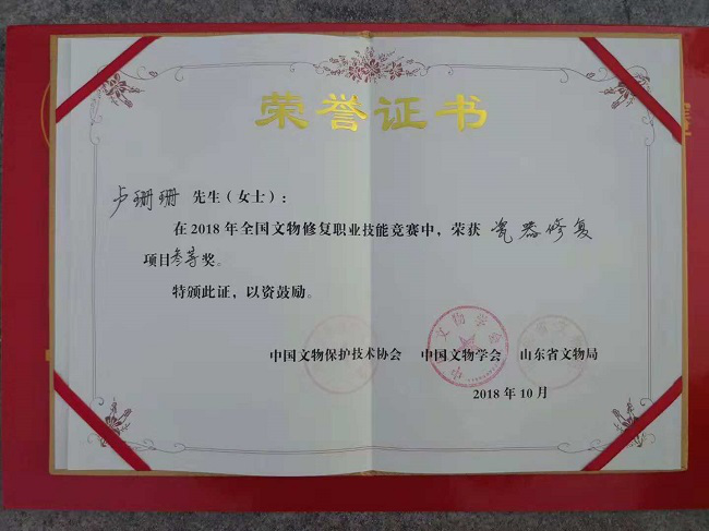 2018年,在山东曲阜举办的第一届全国文物修复竞赛中,我院学生卢珊珊荣获三等奖,是唯一一位在校生获奖,创造了获奖选手年龄最小的记录。