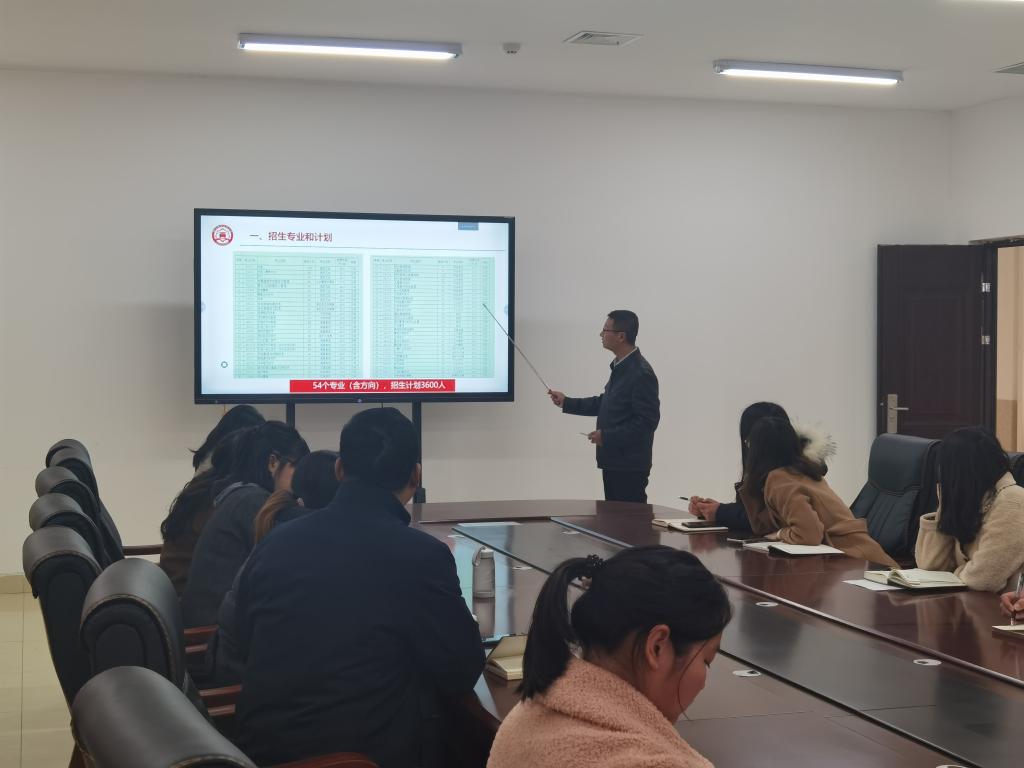 对招生工作,杨刚亮指出,一是思想上要高度重视,以对社会、对考生、对组织、对自己高度负责的态度全身心地投入到招生各项工作中,保证高质量完成工作目标任务。二是明确招生宣传的主体及主要形式,加强网络宣传力度,充分动员自己的资源,全方位、全覆盖将招生信息传递给广大考生及家长。三是明确招生宣传政策及禁忌,认真解读新政策,准确传达信息,规范宣传行为。四是明确目标任务分工,全面抓实工作。
