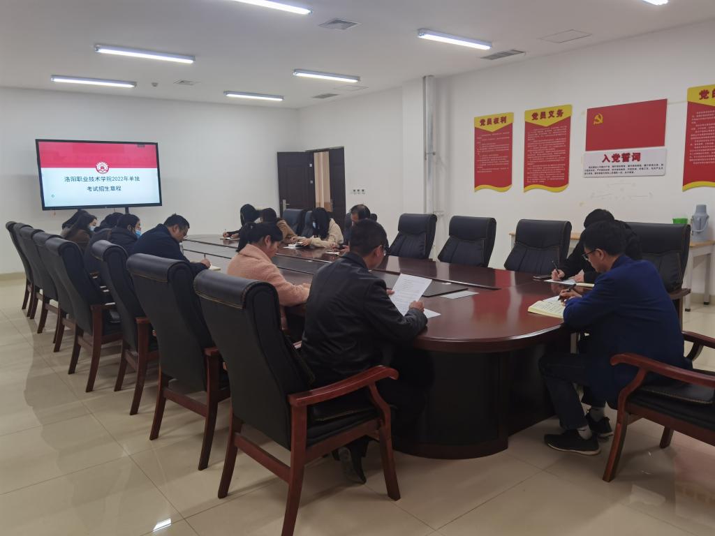 党总支副书记赵博宣读了教育部关于高考招生“六不准、十严禁、十公开、30个不得”规定,带领大家学习了《洛阳职业技术学院2022年单独考试招生章程》,详细讲解招生专业和计划、招生对象、报名流程、考试时间等方面的内容,并对我院2022年招生工作进行了安排部署。
