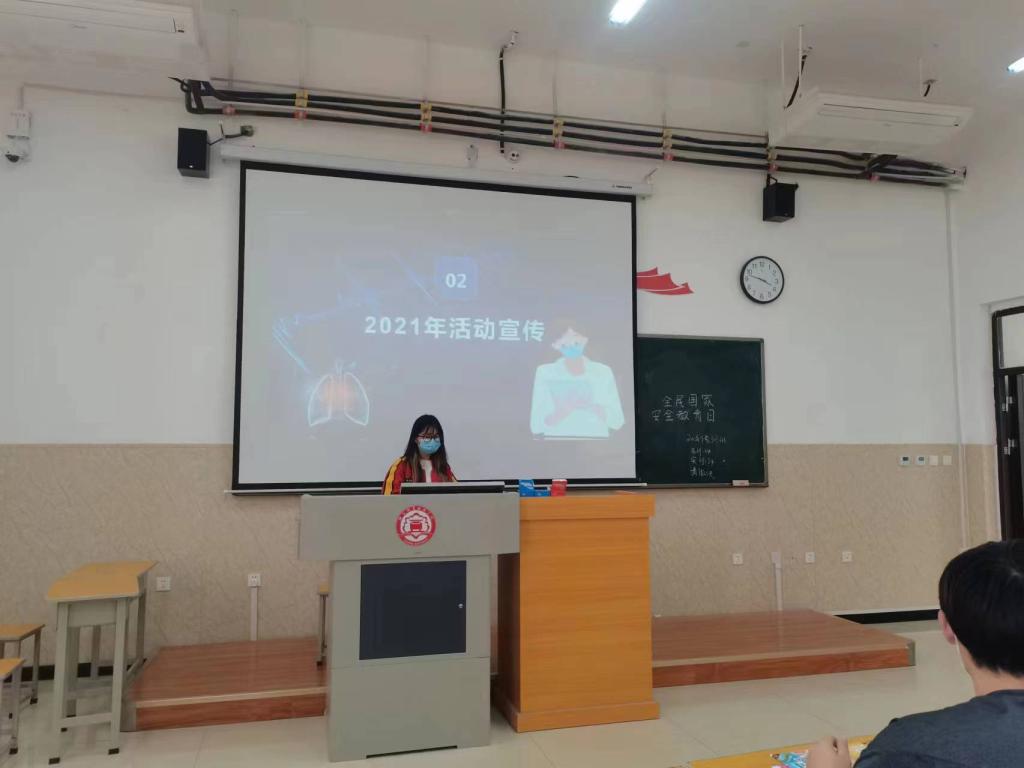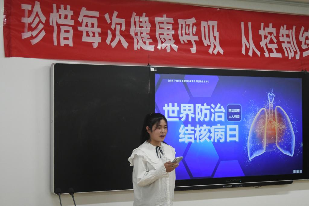 各班班长组织学生召开“珍惜每次呼吸,从控制结核病开始”主题班会,观看防治结核病的PPT和视频,随机抽查3~4名同学做出相关回答,让大家了解结核病并懂得如何预防结核病。