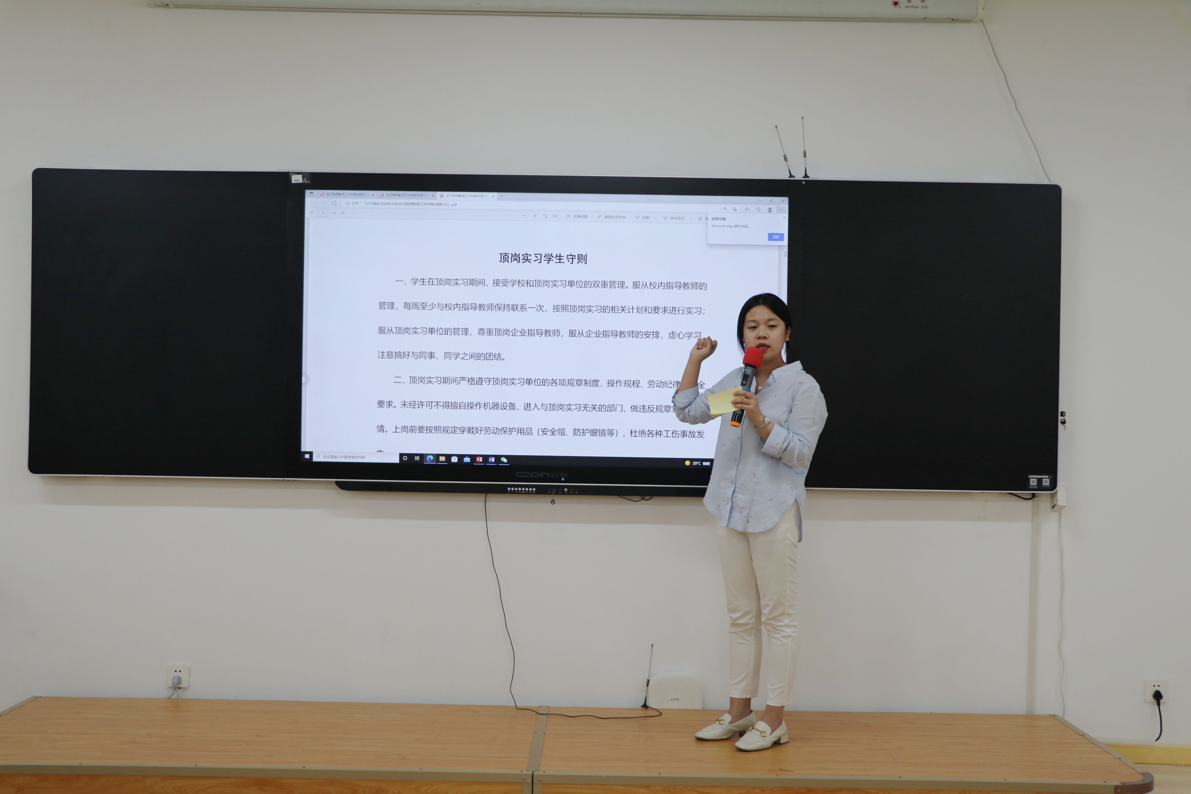 综合办主任侯贤俊在实习动员中向同学们阐明了实习的重要意义,强调实习是实践教学的重要环节,提醒同学们树立生产安全和人身安全意识,遵守企业规章制度,服从管理安排,以积极向上的精神面貌投入到实习工作中。