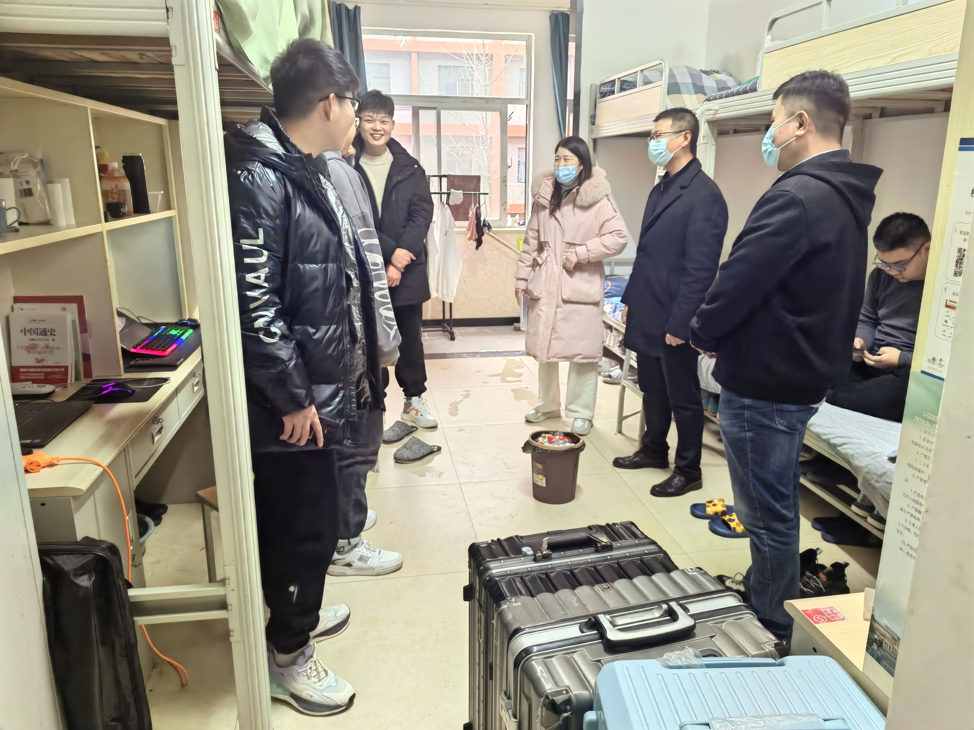 新学期伊始,为及时了解我院学生的返校情况,掌握学生的思想状态,2月12日下午,文物保护考古学院党总支副书记赵博、综合办主任侯贤俊、学工办主任赵晓乐深入学生宿舍进行走访。