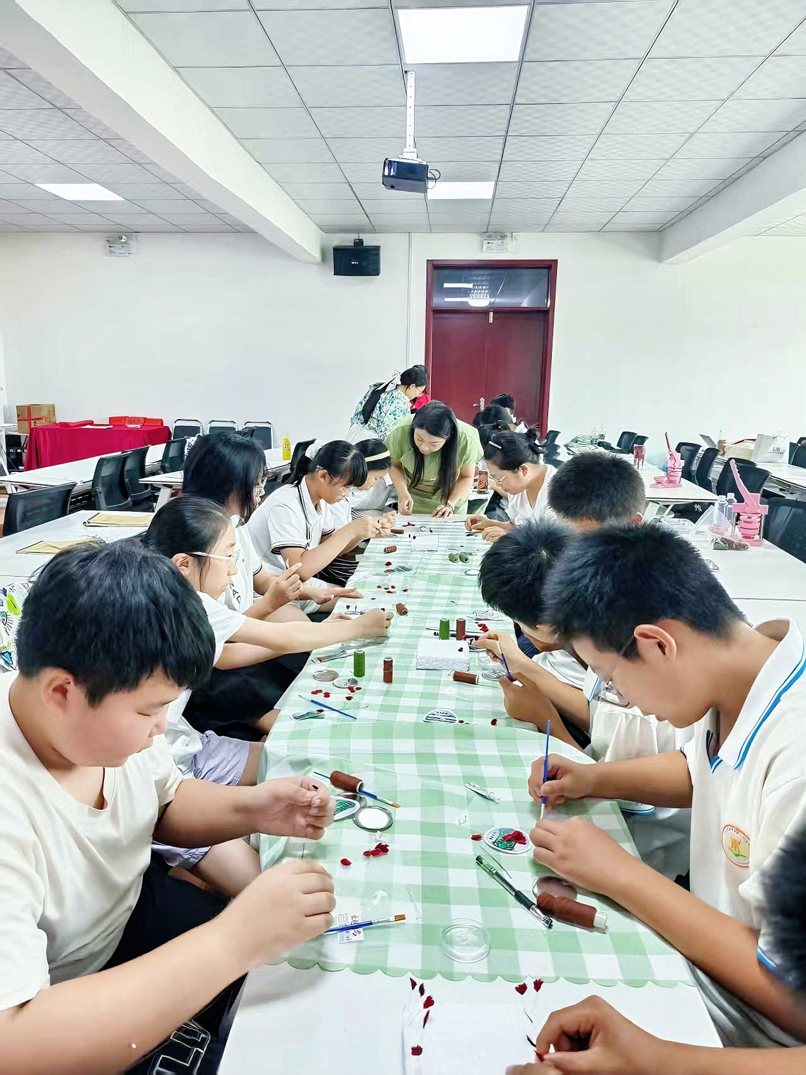 在非遗传承课堂上,同学们学习传承千年的非遗绒花技艺制作二里头绿松石铜牌饰徽章,让非遗技艺与现代创意碰撞,绒花工艺的指尖绽放更彰显文化传承的活力。